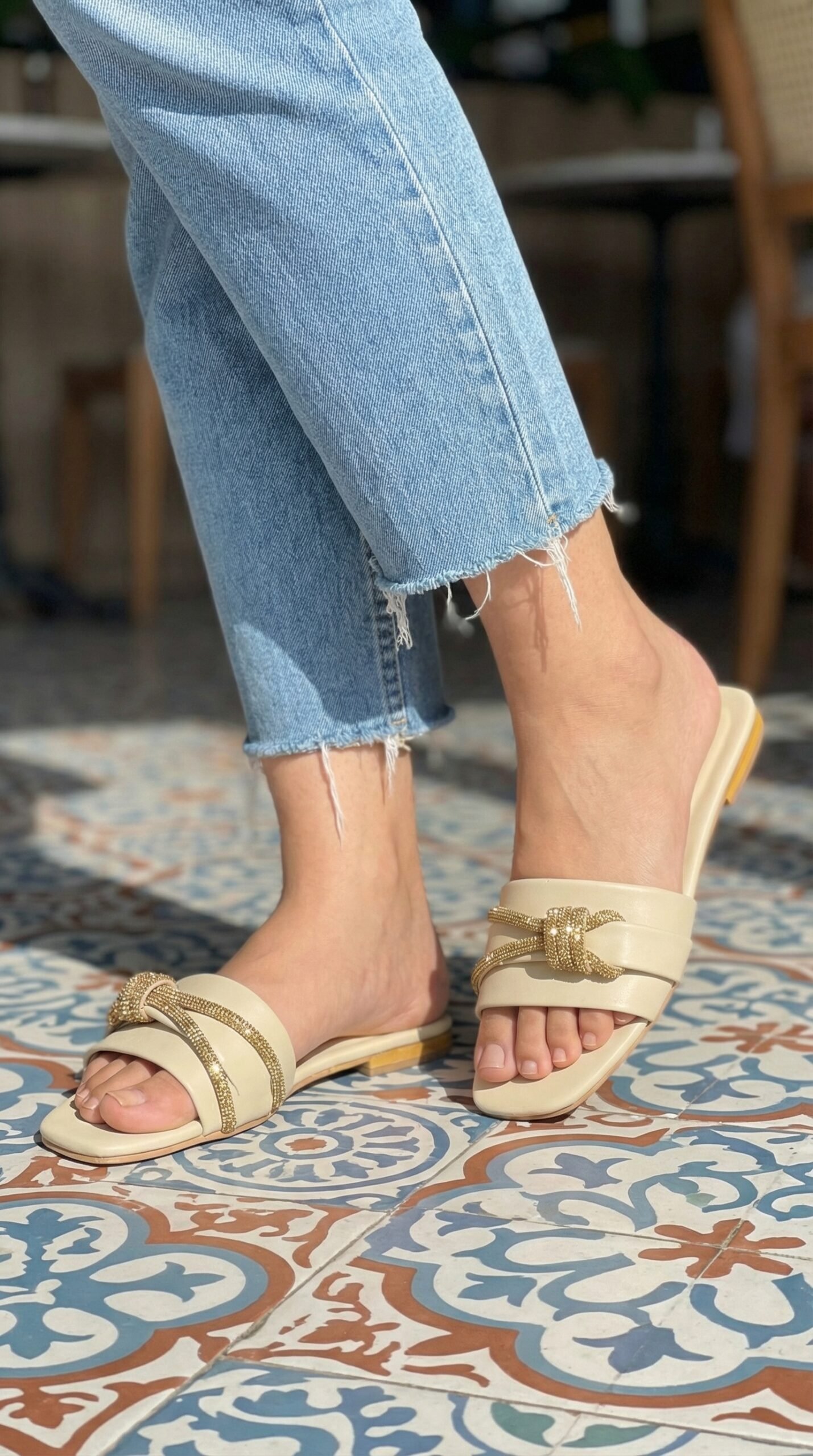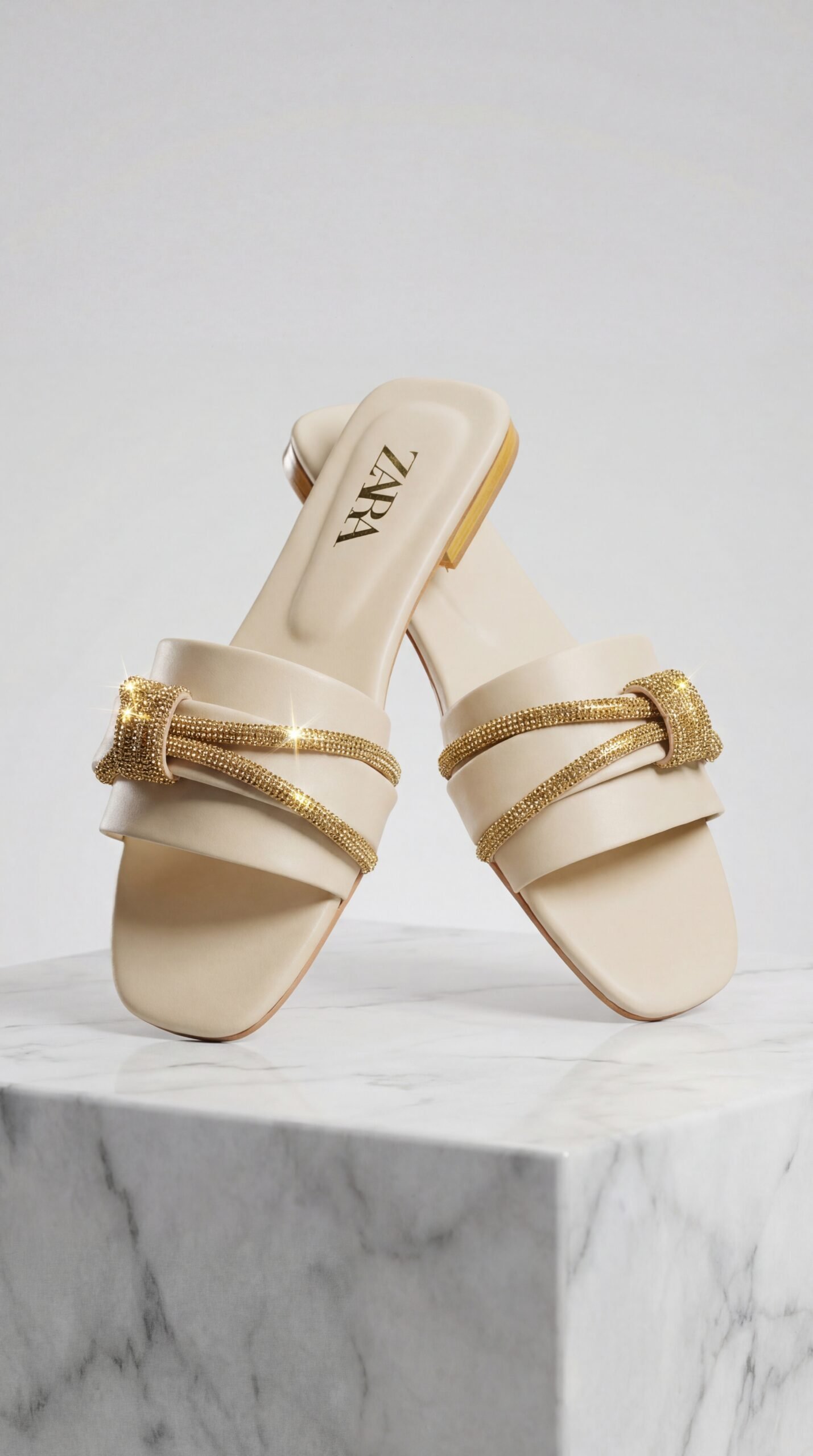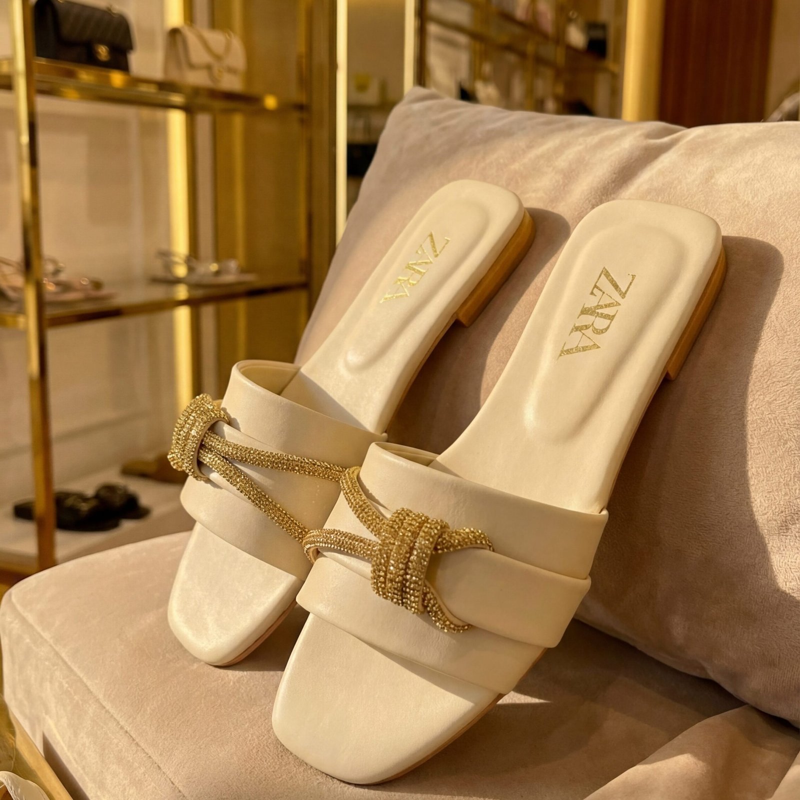 Step into elegance with these Zara-inspired Rhinestone Slides. The soft cream base paired with sparkling gold rope details makes them the perfect choice for both casual hangouts and semi-formal weddings. Comes with branded box packaging.